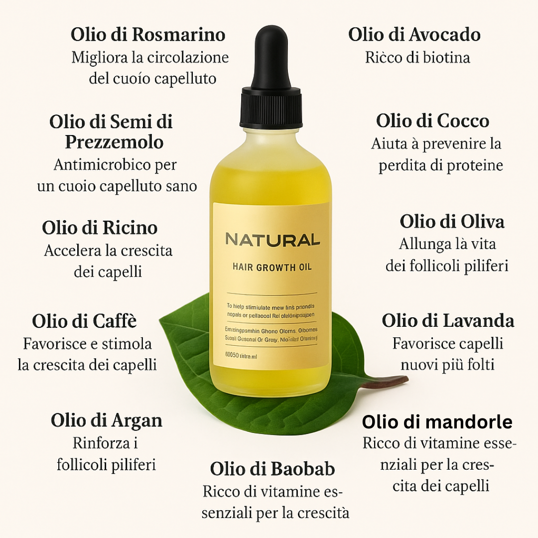 Formulato per favorire la crescita, il nostro olio sfrutta il potere degli ingredienti naturali per accelerare la crescita, ispessire i capelli e mantenere il cuoio capelluto sano. Delicato ma efficace, è un alleato indispensabile per chi sogna una chioma più piena in soli 90 giorni.